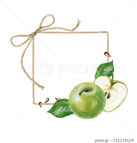A square frame made of twisted twine and ripe green apples with leaves and seeds. The watercolor illustration is isolated on a white background. A botanical template with fruits and an empty place to