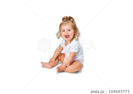 Happy, smiling child. Little baby girl, toddler sitting on floor and cheerfully laughing against white studio background