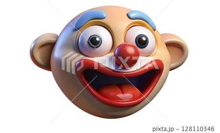 3D Cartoon Clown Head with Red Nose and Wide Smile Expresses Joy Against White Background in Playful Rendered Style