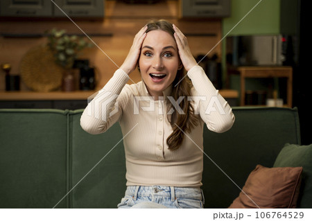 Happy, excited, amazed young woman in a beige sweatshirt, sitting with her palms open and looking at the camera