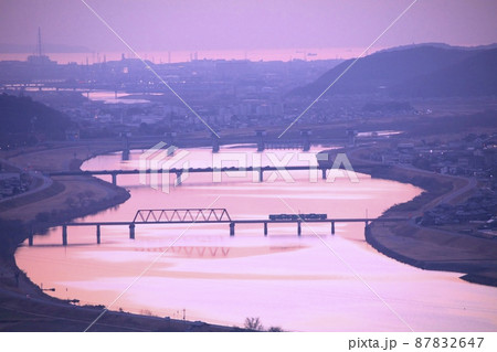 夕暮れ染まりゆく加古川とJR加古川線、厄神鉄橋/遠景に播磨灘/正法寺山展望広場より