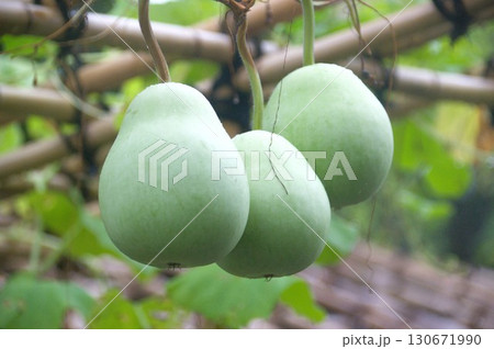 緑の葉と丸い大きな薄緑色の実のひょうたんと小さな瓢箪のなる棚の風景