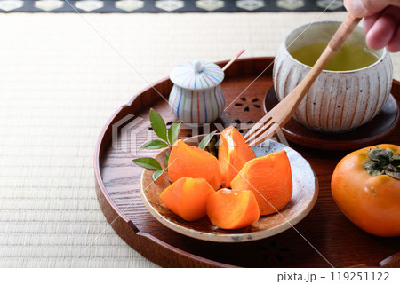 とっても甘い秋の味覚 皿に盛り付けた 柿をフォークでつまむ フルーツ (テーブルバック)柿の実 かき
