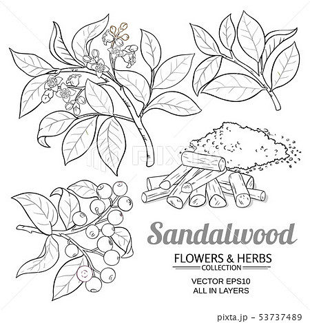 Sandalwood Branch with Flowers and Leaves Outline Illustration.