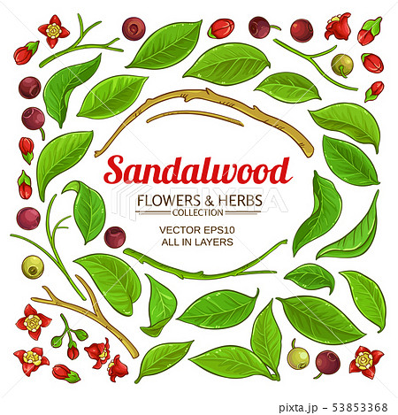 Sandalwood Tree Plant Branch with Mortar and Oil Jar Vector Set