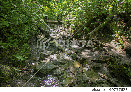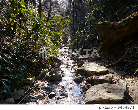 高尾山の小川が流れる6号路びわ滝コースの様子