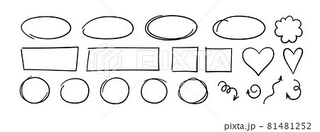 Set of hand drawn circles, ovals, hearts and arrows. Highlight circle frames. Ellipses and curly arrows in doodle style. Vector illustration isolated on white background