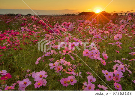 埼玉県鴻巣市明用 鴻巣コスモスアリーナふきあげ周辺の荒川河川敷に咲くコスモス畑と夕陽