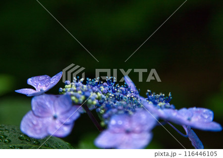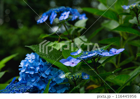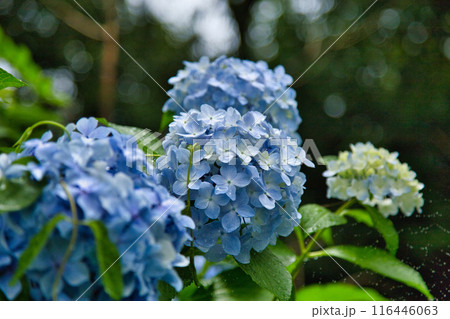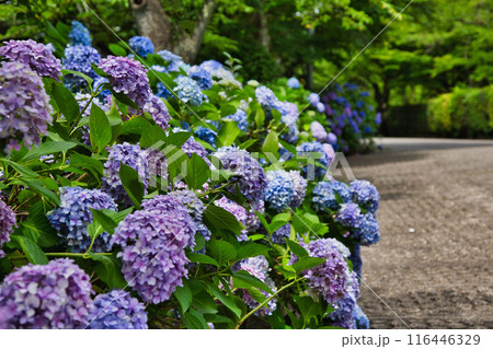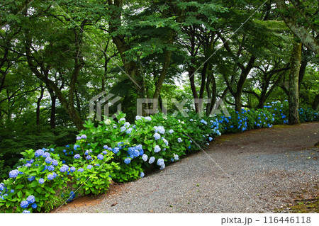 春を迎え、雨上がりのアジサイが見頃の足羽山
