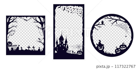Halloween media post frame templates with pumpkins and cemetery silhouette, vector borders. Halloween holiday social media storytelling post frames with bats, owl and spider on cobweb on graveyard