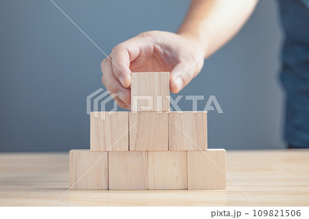 hand of a businessman stacking wood empty eight blocks with copy space for text or symbols, development concept for growth success process.