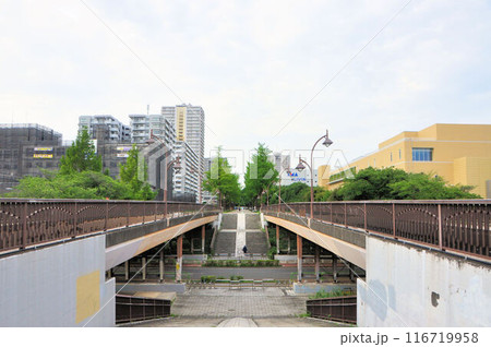 日本の川崎都市景観 二子新地駅東口への細い通路や周辺の街並み(二子橋、サイン「神奈川県川崎市」)