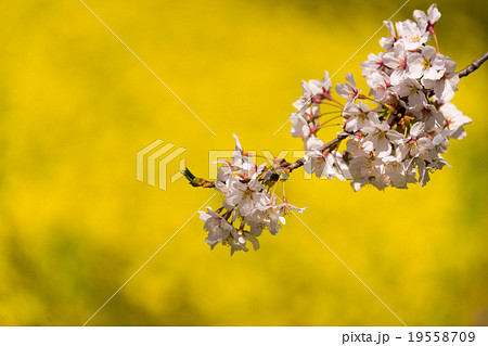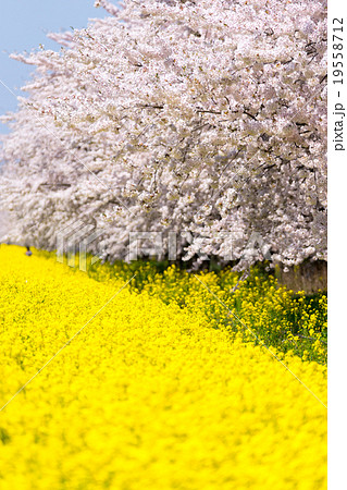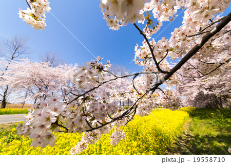 桜と菜の花ロード晴天の青空と春爛漫満開のさくらと黄色いじゅうたん菜の花の綺麗なコントラスト