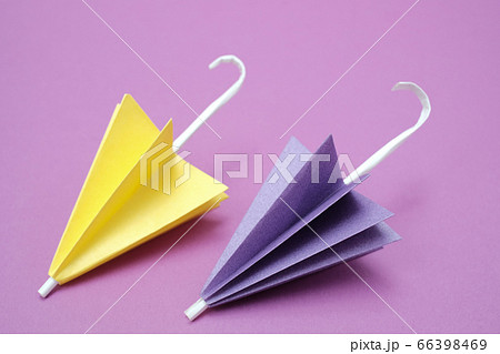 紫色のバックに折り紙の黄色い傘と紫の傘