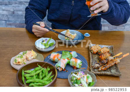 ビールを片手に飲み食いする人の姿