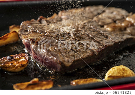 厚切りのステーキ肉にスパイスをふりかける料理人