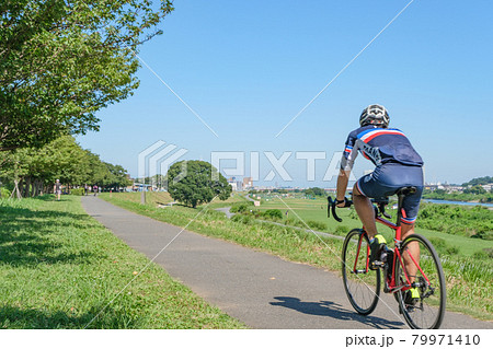 サイクリングのイメージ 新緑の多摩川堤防を駆けるライダー