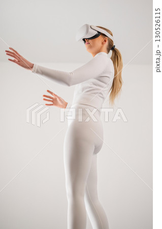 Young woman wearing VR headset and gesturing