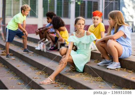 Cheerful preteen girls and boys sitting on steps outdoors and chatting