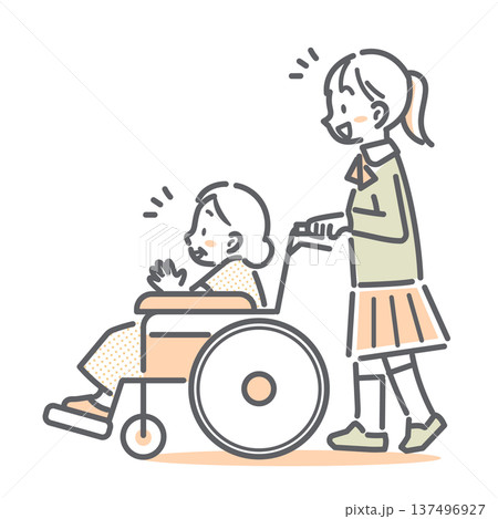 シニア女性の乗った車椅子を押しながら会話をする女子高生 シンプルでお洒落な線画イラスト