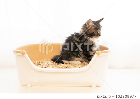 小さなトイレに座ったメインクーンの仔猫