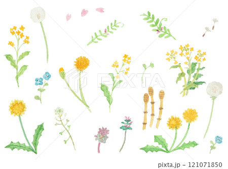 水彩絵の具で描いた春の野原のお花のセット