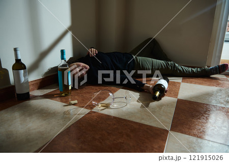 Person on tiled floor surrounded by empty alcohol bottles with glassware