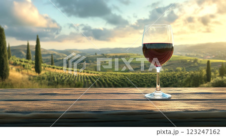 Wine glass on rustic wooden table against backdrop of vineyard hills. A serene landscape with rich red wine on display.
