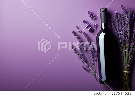 Wine bottle lies amidst lavender flowers on purple background. Conjures relaxation and indulgence themes, ideal for wine and floral-themed designs
