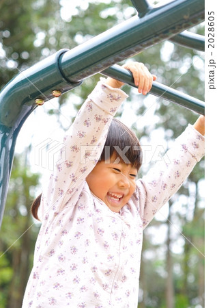 鉄棒にぶらさがる3才のカメラ目線の女の子