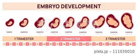 Human fetal development infographics. Embryo growth prenatal stages. Medical poster. Gynecological education. Nine months cycle. Trimesters chart. Embryonic change. Garish vector concept