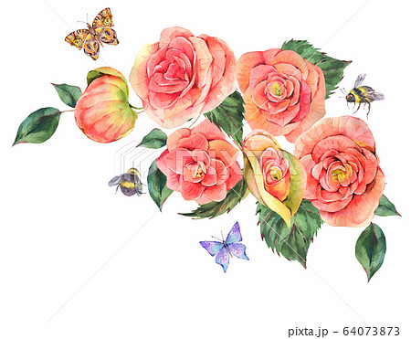 Watercolor vintage summer wreath begonia flowers