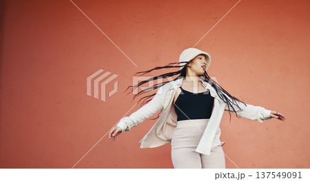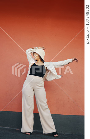 Happy woman, fashion and city wall with freedom, hipster style and urban clothes with confidence. Red background and stylish female person in town with cool and streetwear outfit and thinking