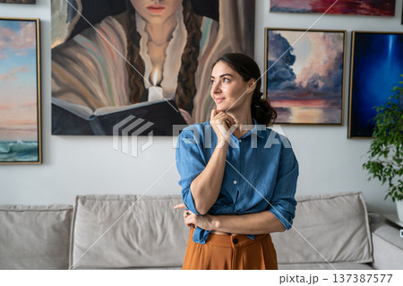 Successful woman painter thinking and getting inspiration while posing against painting exhibition.