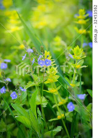Blue speedwell flowers in green grass, tiny blue wildflowers in meadow.