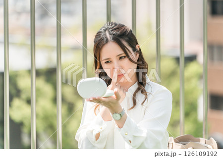 化粧直し・メイク直しをする女性(小鼻,鼻,花粉症,くしゃみ,鼻炎, 毛穴,黒ずみ,角栓)
