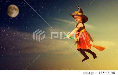 Halloween. Witch child flying on broomstick at sunset night sky.