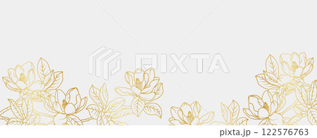 Luxury gold magnolia flowers background. Floral pattern tropical in line art style for greeting, invitation, wedding card, wall art, wallpaper and print. Vector illustration