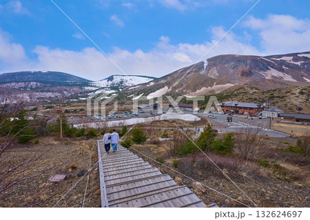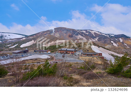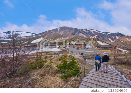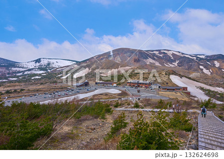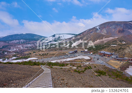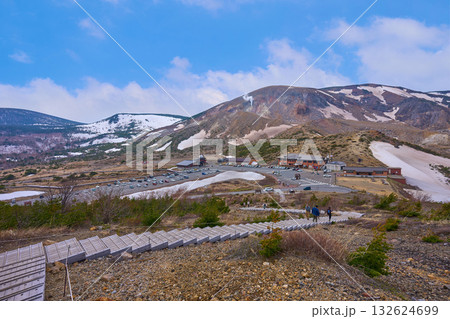 福島県福島市の吾妻小富士の階段からの北西側の眺望(浄土平レストハウス,駐車場,蓬莱山,一切経山,残雪