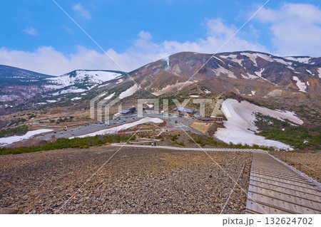 福島県福島市の吾妻小富士の階段から西側の眺望(浄土平,駐車場,蓬莱山,東吾妻山,残雪など)