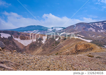 春の福島県福島市の吾妻小富士の西側稜線からの西側の眺望(東吾妻山,蓬莱山,浄土平湿原など)