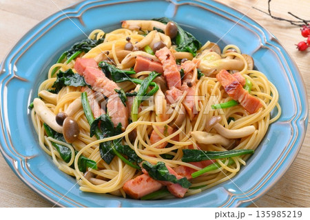 和風パスタ、和風スパゲッティ、ベーコンとほうれん草とシメジの和風醤油パスタ。