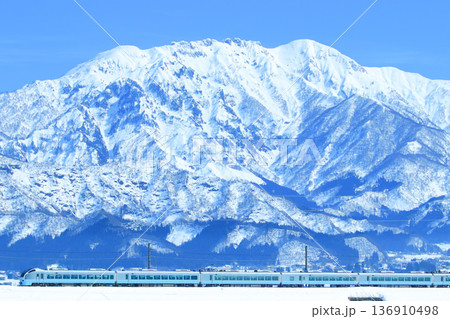 雪化粧の八海山が美しい冬のほくほく線。