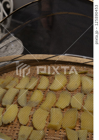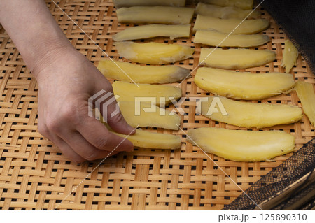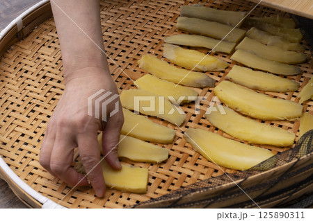 干し芋を作る工程 干しざるに並べたサツマイモを天日干しにする