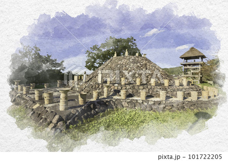 水彩画風 伯耆古代の丘公園 ほたて貝式古墳 鳥取県米子市