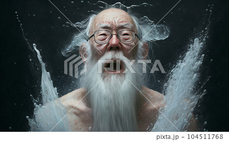 年寄りの冷や水:気持ちよさそうに冷たい水を浴びている老人。顔はちょっと我慢の様子がうかがえます。