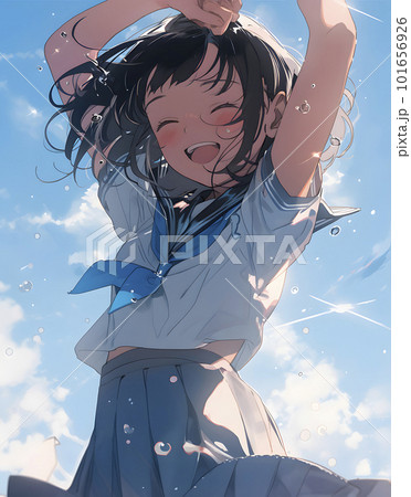 夏の大空の下 ジャンプする女子生徒「AI生成画像」