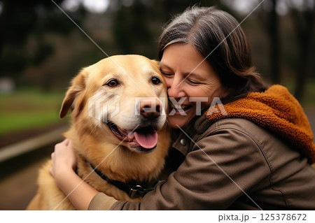 Soulful Embrace Affectionate Mature Woman and Joyful Labrador Share Heartfelt Connection, Reflecting Strong Bond and Timeless Companionship in Outdoor Serenity.. created with Generative AI