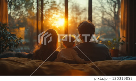 A family of three sits together on a comfortable couch, watching a beautiful sunset through large windows, surrounded by soft lighting and greenery.