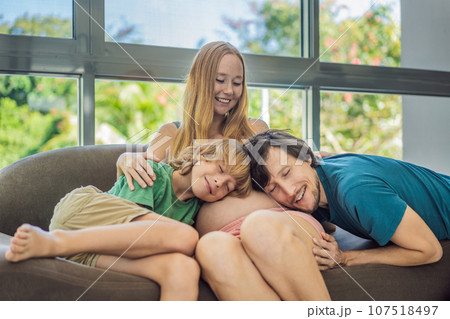 Expectant parents, mom, dad, and their eldest son share a heartwarming moment on the sofa, discussing the exciting journey of pregnancy